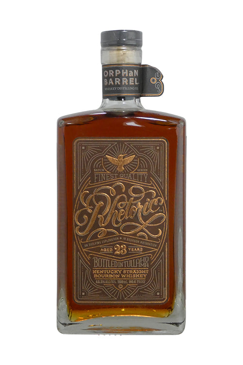 Rhetoric 23 Kentucky Straight Bourbon Whiskey Ten steps ahead in a dance of discourse, Rhetoric Whiskeys candy-coats and compels with equal amounts of art. Proper, eloquent, and poetic, this collection of Kentucky Straight Bourbon Whiskey speaks a language to which you could listen for hours. An ever-changing specimen, Rhetoric is an experiment in how barrel maturation imparts a lasting impression year after year. Each new year results in an older and wiser limited release from remaining maturing stock. A conversation piece if there ever was one. Each sip starts with a smoky, leathery nose that translates into vanilla oak, toasted rye, and dried fruits, and concludes with a long, full finish of cherry blossom and bitter chocolate. RHETORIC 23-YEAR-OLD KENTUCKY STRAIGHT BOURBON WHISKEY. 45.3% Alc/Vol. Orphan Barrel Whiskey Distilling Co., Tullahoma, TN. 23 years MATURED 45.3% ABV Rhetoric features notes of smoked vanilla oak, toasted rye, and dried fruits with a long, full finish of cherry blossom and bitter chocolate